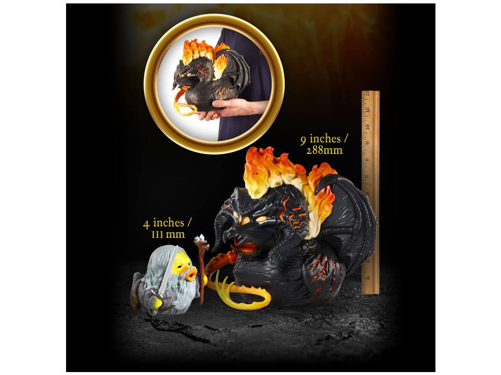 Impozantní Balrog, démonická kachna, se vynoří z dolů Morie, aby způsobil zkázu na kachním jezírku. Tento jedineční sběratelsky kus, který je dodáván v úžasné krabici s motivem Pána prstenů, je skvěly pro fanoušky této série!