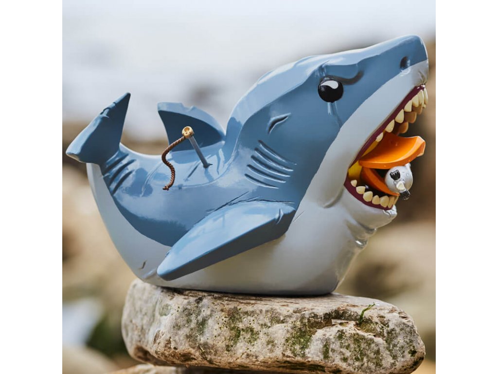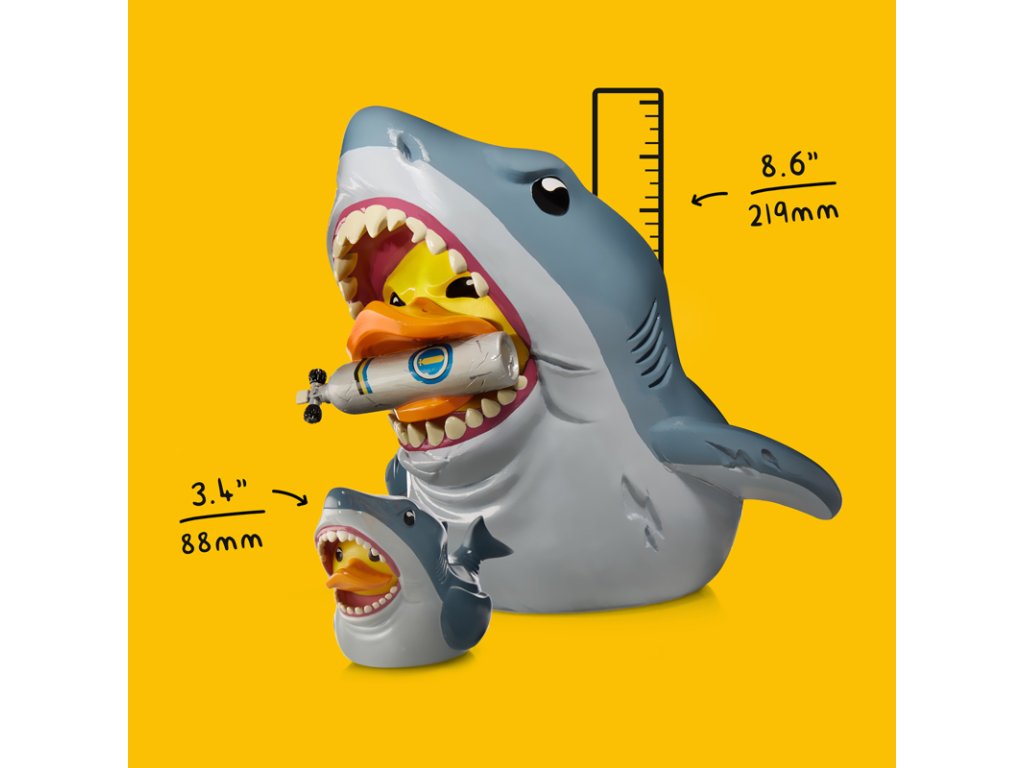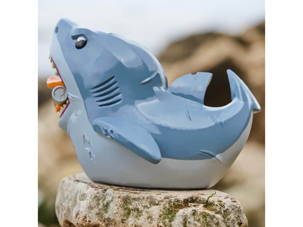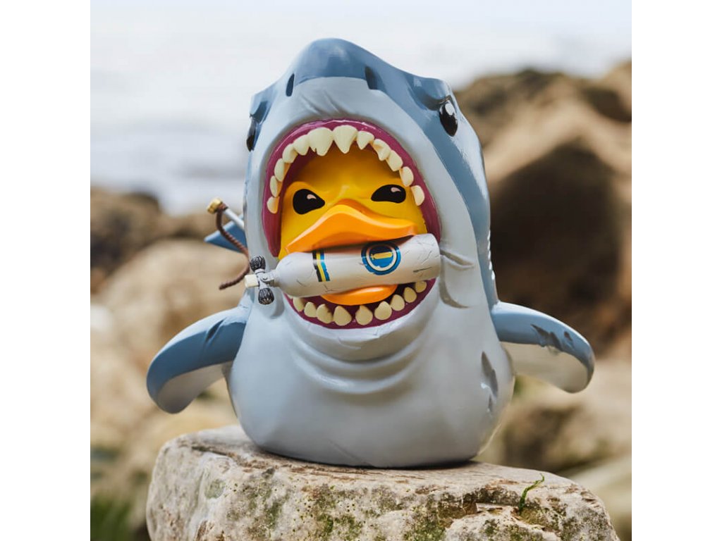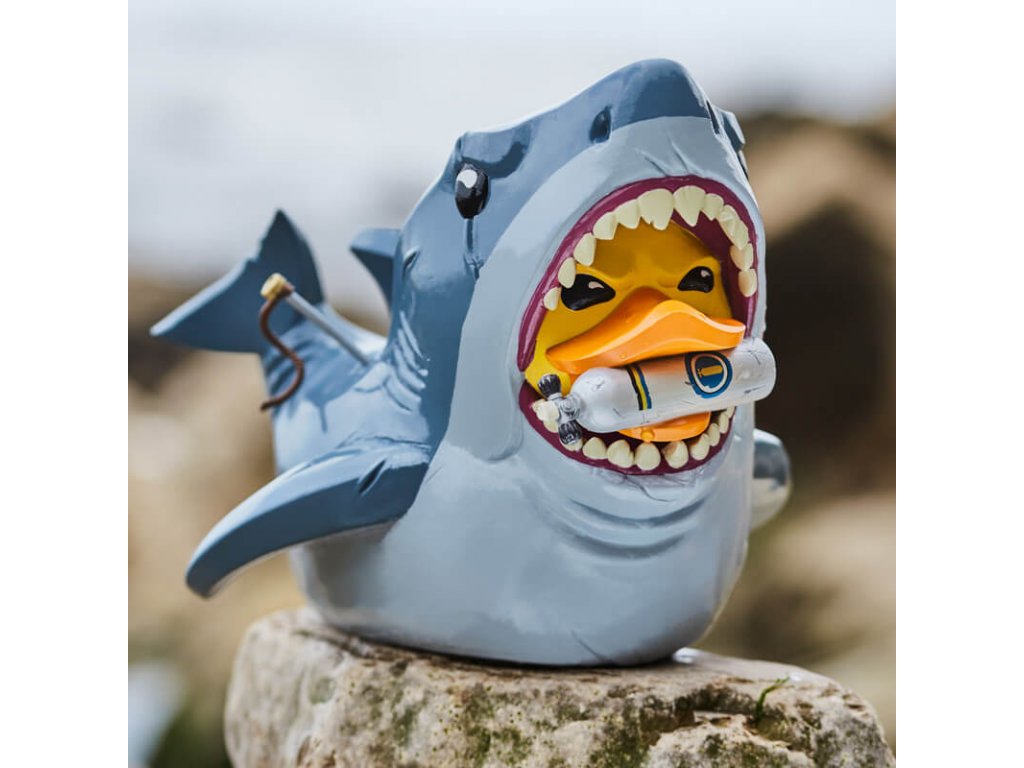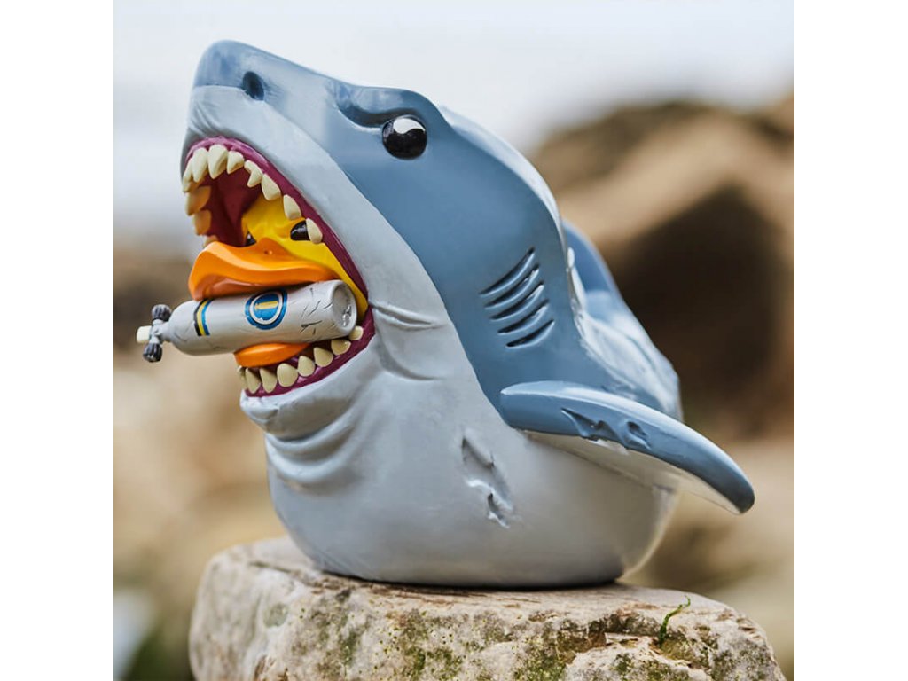 Da dum da dum… lovci žraloků chytili žraloka, byl harpunován, strčili mu do tlamy potápěčský tank a bingo, konec hry! Fanoušci Jaws, toto je extra speciální sběratelský kousek – cosplayující kachna Jaws Bruce velikosti XL. Prostě výjimečný kousek v každé kolekci.