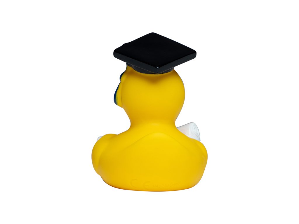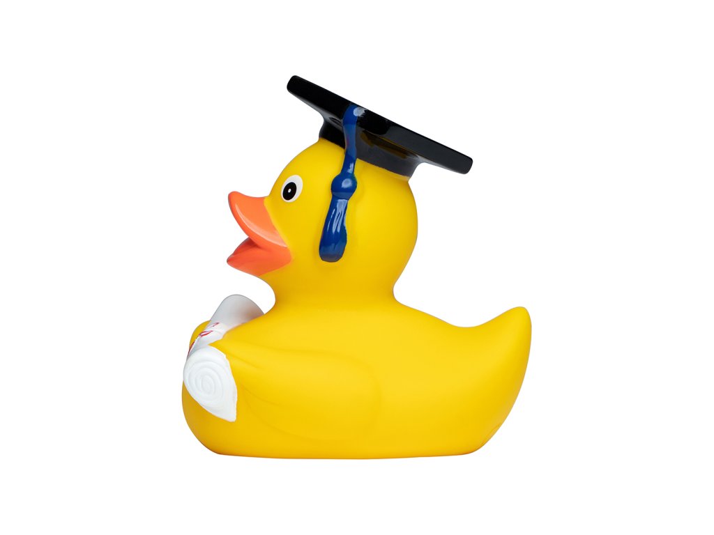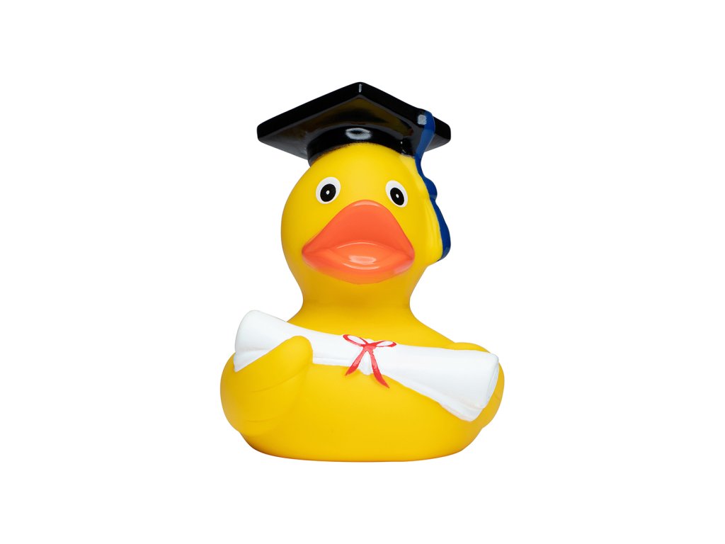 Právě získal magisterský titul: Naš magistr gumová kachnička. V ruce nebo pod křídlem drží kachnička magisterský titul. Na hlavě hrdě nosí svou magisterskou čepici. Tato pískací kachna je perfektním dárkem pro studenty, absolventy a doktorandy. Hodí se na jakoukoli univerzitu a vysokou školu.