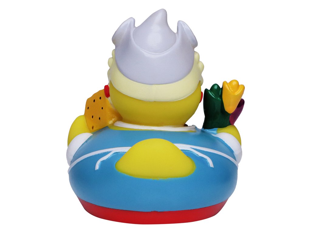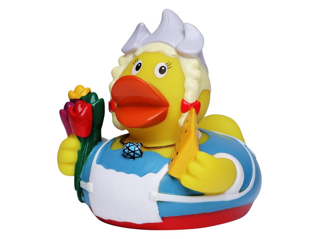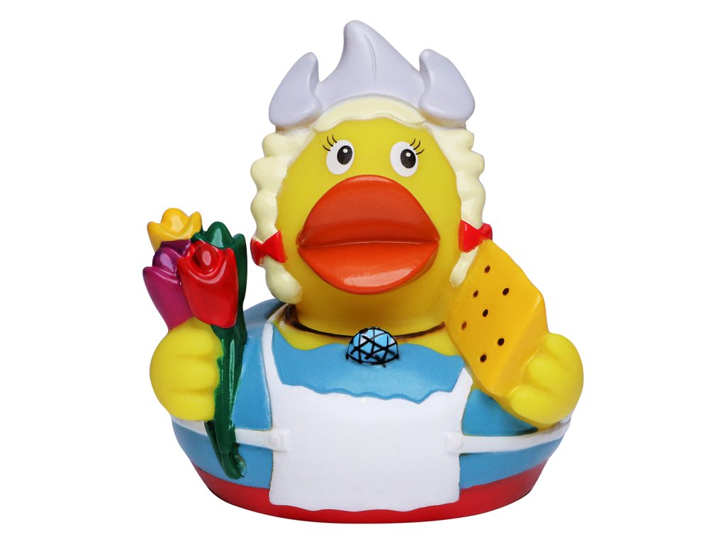 Co opravdu odlišuje tuto gumovou kachnu, je její jedinečný design. S tulipány a sýrem, který hrdě drží v ruce, zachycuje dva ikonické symboly holandské kultury. S klasickým spleteným účesem a tradičním kostýmem ztělesňuje kouzlo a radost ze života Amsterdamu. Přináší nádech Holandska přímo do vaší koupelny!